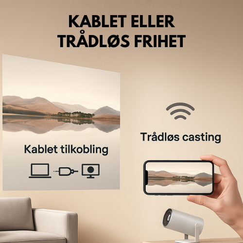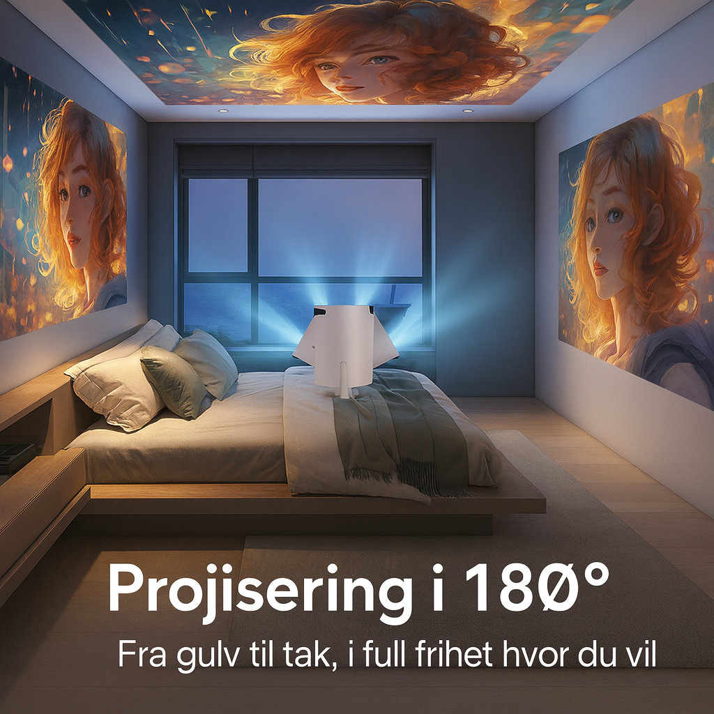 Projektoren er utrolig allsidig og lar deg projisere bilder fra koselige 40 tommer helt opp til 200 tommer. Perfekt til enhver anledning – enten det er en intim filmkveld eller et større arrangement.